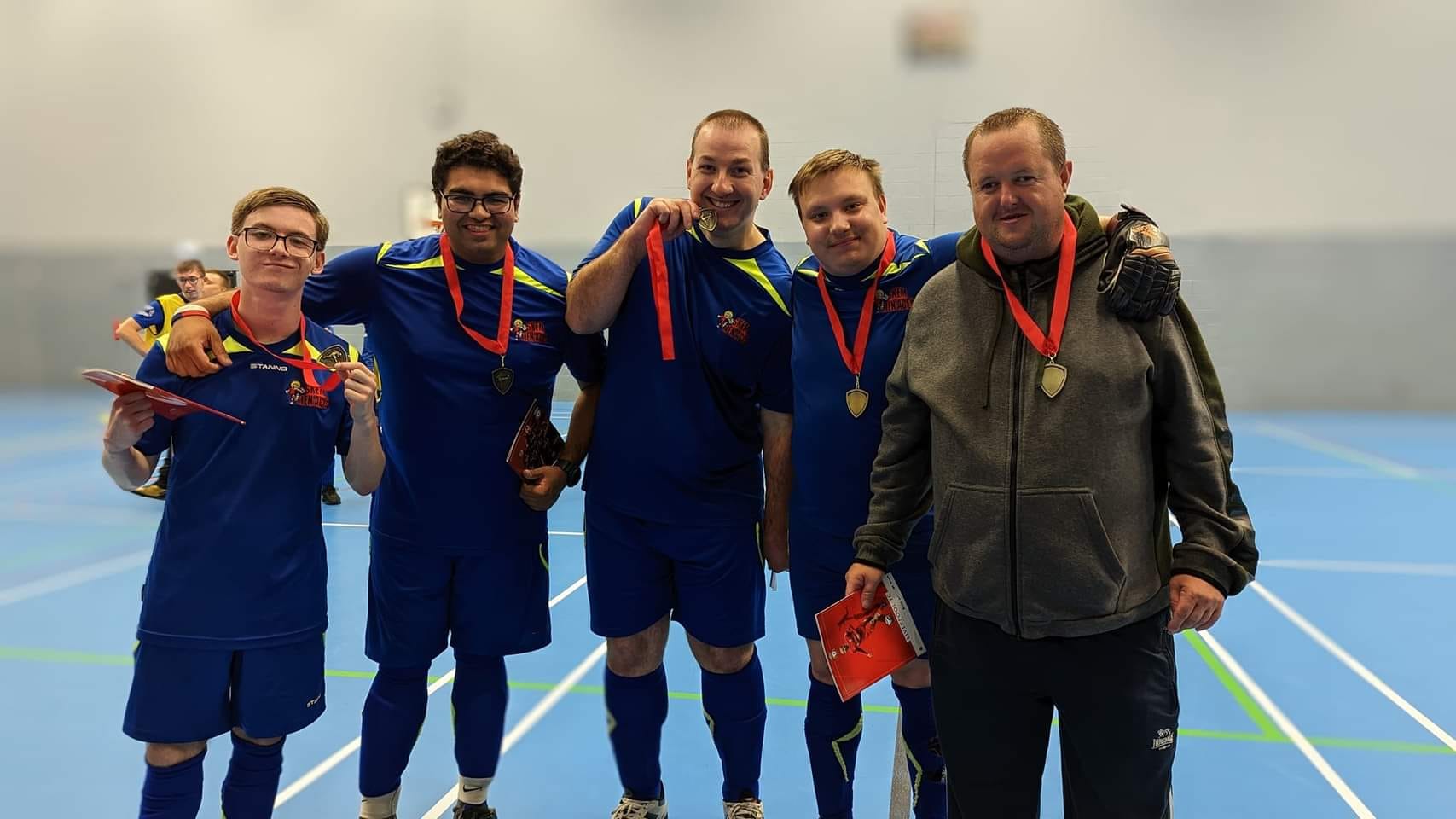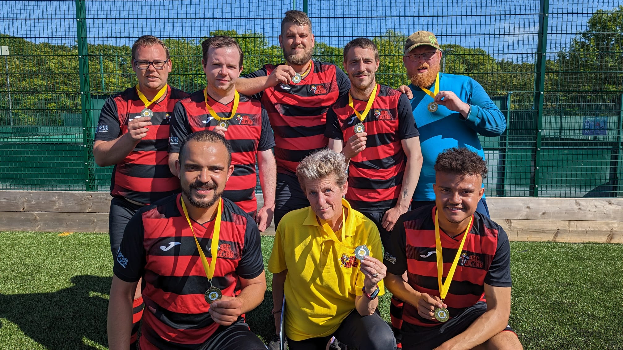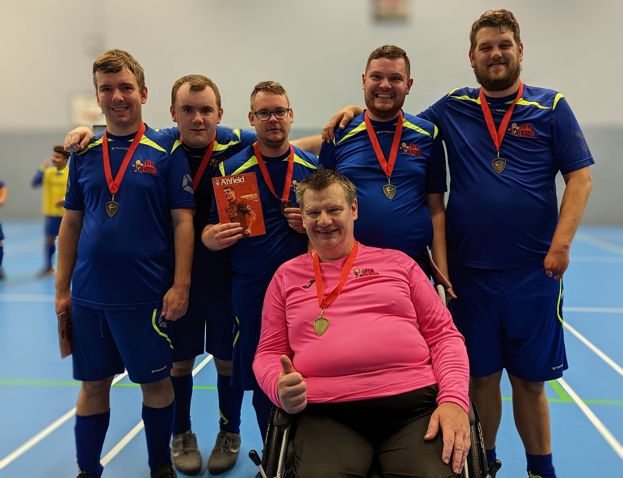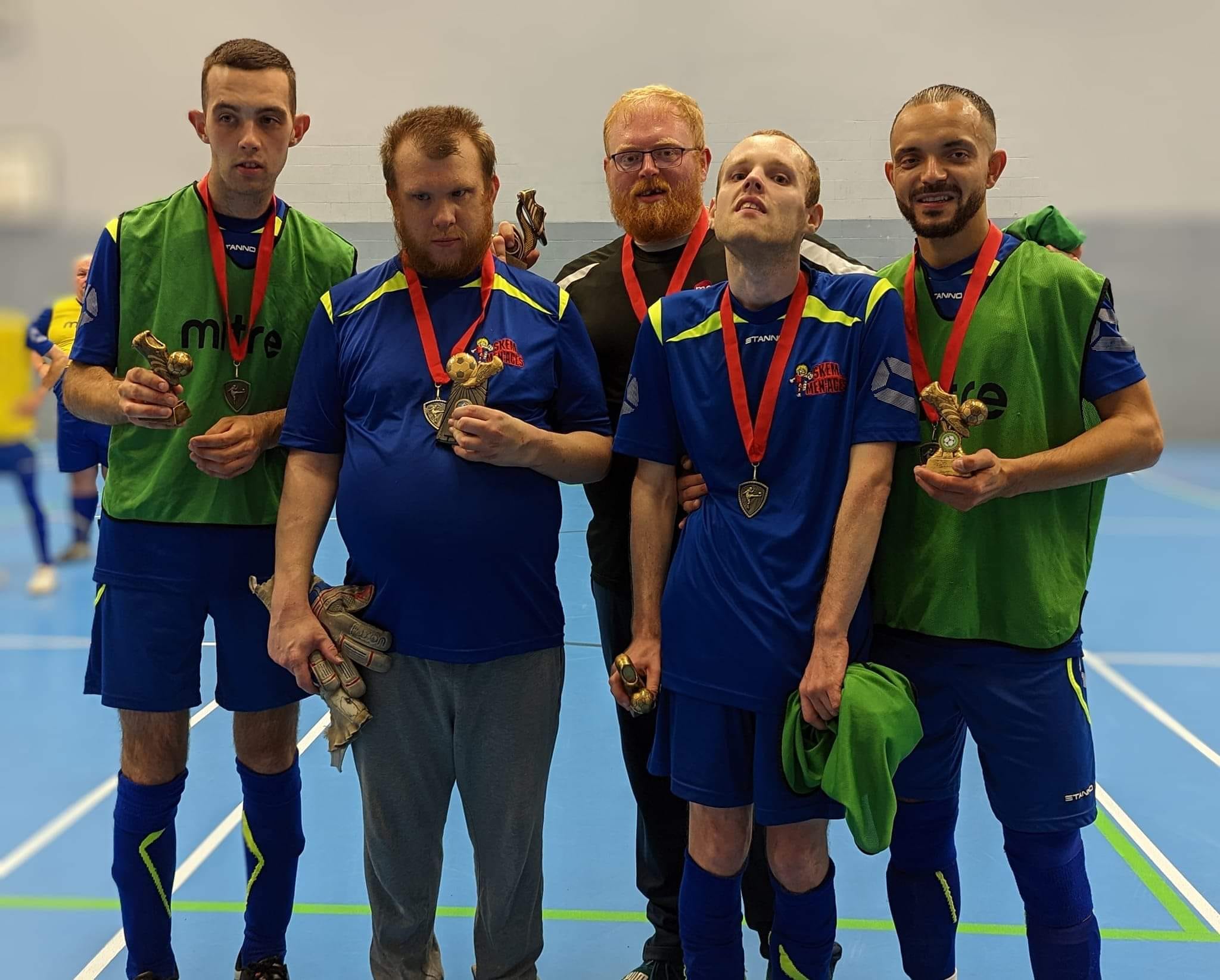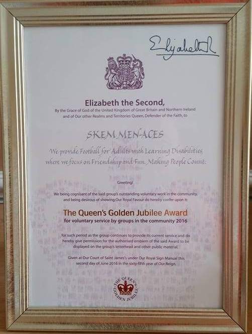 Our journey has been a rollercoaster of emotions, filled with challenges and extraordinary achievements. From those early days of playing on borrowed time with two coats serving as goalposts, we’ve grown into a formidable force of sixty players. The Skem Men-Aces are now synonymous with success, our trophy cabinet a testament to our dedication and talent. A Queen's Award for Voluntary Services, Silver medals at the Special Olympics, and the Freedom of the Borough of West Lancs and BBC Unsung Hero are just some of the accolades that adorn our name. Our players have not only conquered domestic football but have also proudly represented their country on the international stage.
